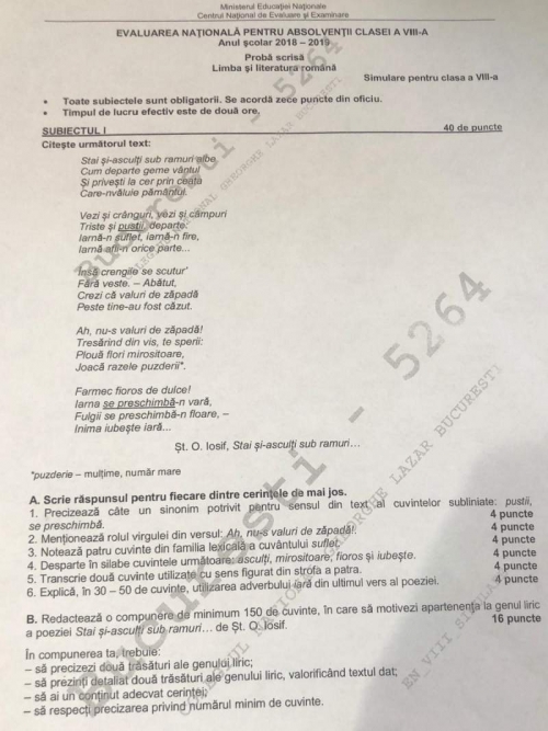 Subiectele au fost structurate în două mari cerințe. Potrivit edu.ro, la primul subiect elevii au trebuit să răspundă la mai multe cerințe pe baza unui fragment la prima vedere din poezia “Stai și-asculți sub ramuri…” de Ștefan Octavian Iosif.