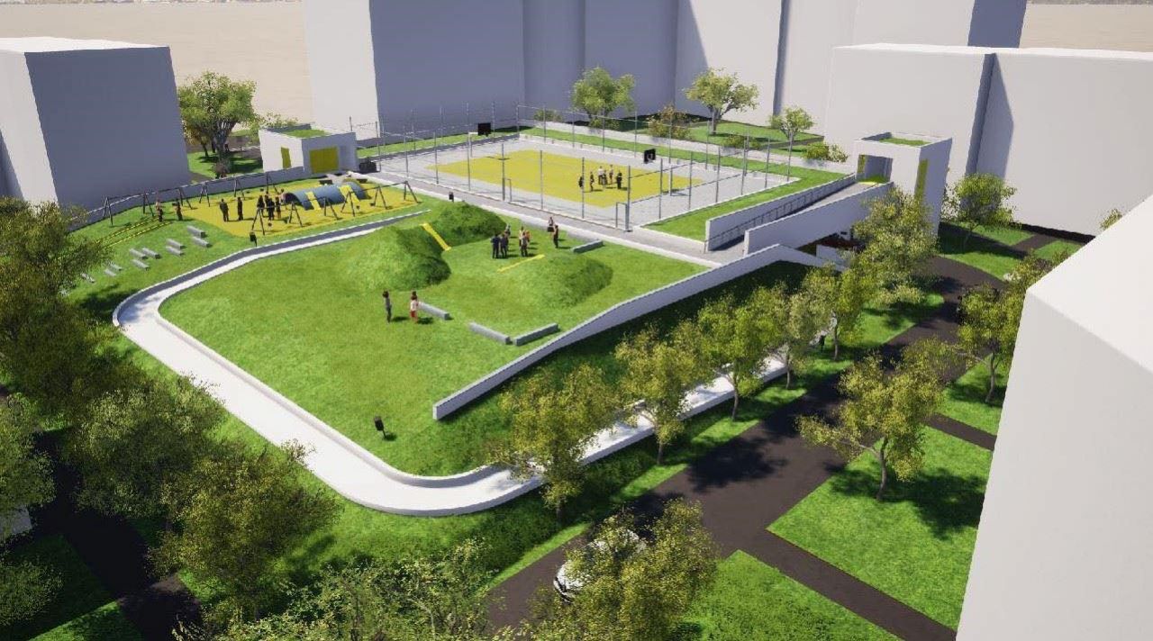 Pe acoperișul terasă au fost prevazute teren de baschet, loc de joacă dotat cu tobogane, leagăne pentru copii și un ansamblu de joacă.
