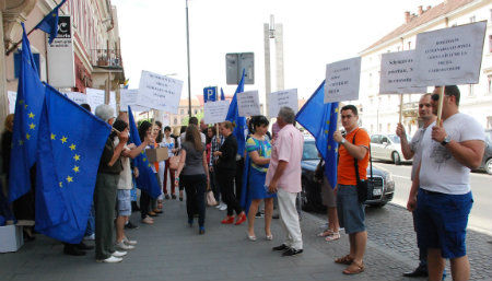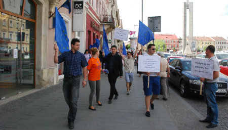 Tinerii democrat liberali clujeni (TDL) au protestat astăzi, de Ziua Europei, la sediile PNL şi PSD din Cluj-Napoca, faţă de măsurile luate de USL, într-un an de guvernare.